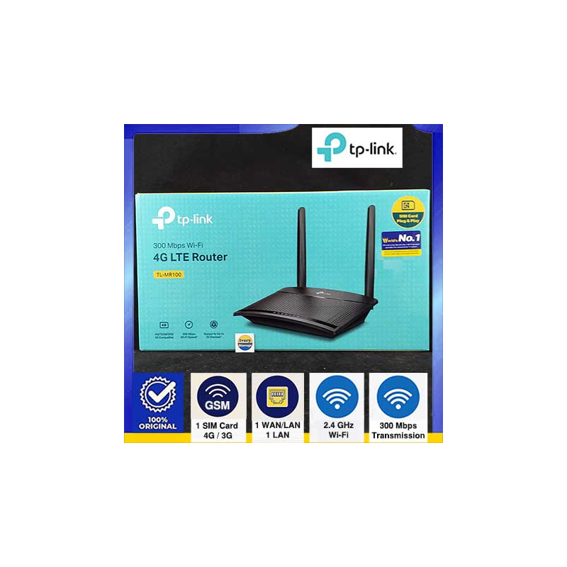 300Mbps Wireless N LTE 4G Router TL-MR100 TP-Link menggunakan 300Mbps Wireless Access Point, 2 buah port full-duplex Switch 10/100Mbps yang built-in(10/100M LAN Ports(RJ45)), 1 buah LAN/WAN Port(RJ45)), 1 buah Slot SIM Card untuk kartu GSM(hingga spesifikasi 4G, support FDD-LTE & TDD-LTE) yang bebas setting(otomatis kenal) dan 2 buah antena(Tx & Rx) dengan MIMO Technology sehingga Anda dapat menggunakan kartu GSM 4G/3G sebagai sumber penyedia internet untuk berbagi DSL berkecepatan tinggi/koneksi internet/printer/hard disk ke 10 pengguna(32 buah IP) dan aktifitas yang menyedot bandwidth yang tinggi dengan kualitas yang bagus/ideal, memastikan jaringan Anda selalu terkoneksi dengan internet karena produk ini dapat menampung hingga 2 penyedia broadband internet yang berbeda dalam satu alat(misalnya: WAN port terhubung ke Indihome/Biznet/Firstmedia,dll) dan kartu GSM sebagai cadangan jika ISP kabel down, agar Anda bisa mengalihkan sambungan koneksi internet pertama(misal: Indihome atau Biznet) ke koneksi internet kedua(misalnya GSM Telkomsel/Indosat/XL) bila koneksi pertama terputus secara otomatis, menghubungkan atau menyatukan Komputer/Laptop/Notebook/Handphone wifi/Peralatan Wifi lainnya dalam satu jaringan(1 buah komputer dengan kabel UTP dan komputer/peralatan lainnya menggunakan wifi(tanpa kabel), melakukan HD video streaming/Voice chat/online gaming/internet calling/kegiatan lainnya, memberikan Anda fleksibilitas pemilihan provider internet dengan pertimbangan biaya dan lamanya waktu down time karena saluran terputus/pemeliharaan jaringan provider/koneksi lemah, membagi bandwith dari kartu GSM Anda ke banyak komputer/peralatan wifi lainnya tanpa perlu komputer utama menyala(USB Modem standby dan siap di sharing ke banyak komputer melalui router alat), dan dapat digunakan di daerah yang belum ada koneksi ISP melalui kabel(misalnya dapat di koneksikan ke kamera pengawasan peternakan/pertanian.