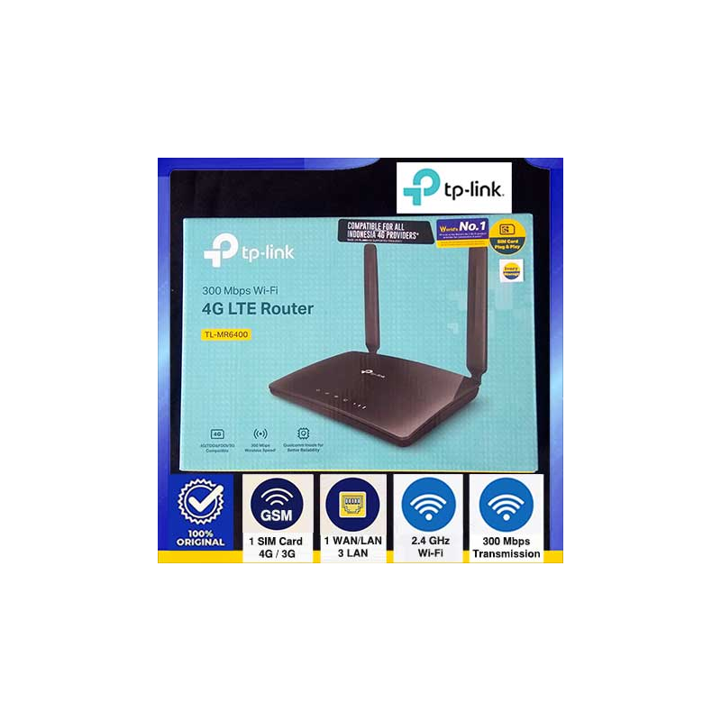 4G LTE Router TP-LINK TL-MR6400 300Mbps dengan Slot Kartu GSM menggunakan 300Mbps Wireless Access Point, 3 buah port full-duplex Switch 10/100Mbps yang built-in(10/100M LAN Ports(RJ45)), 1 buah LAN/WAN Port(RJ45)), 1 buah Slot SIM Card untuk kartu GSM(hingga spesifikasi 4G) yang bebas setting(otomatis kenal) dan 2 buah antena(Tx & Rx) dengan MIMO Technology sehingga Anda dapat menggunakan kartu GSM 4G/3G sebagai sumber penyedia internet untuk berbagi DSL berkecepatan tinggi/koneksi internet/printer/hard disk ke 10 pengguna(10 buah IP) dan aktifitas yang menyedot bandwidth yang tinggi dengan kualitas yang bagus/ideal, memastikan jaringan Anda selalu terkoneksi dengan internet bila dikombinasikan dengan penyedia internet jaringan kabel/ISP (seperti Indihome,Biznet,Firstmedia, MNC,dll.) karena produk ini dapat menampung hingga 2 penyedia broadband internet yang berbeda dalam satu alat(misalnya: WAN port terhubung ke Indihome/Biznet/Firstmedia,dll) dan kartu GSM sebagai cadangan jika ISP kabel down, agar Anda bisa mengalihkan sambungan koneksi internet pertama(misal: Indihome atau Biznet) ke koneksi internet kedua(misalnya GSM Telkomsel/Indosat/XL) bila koneksi pertama terputus secara otomatis, menghubungkan atau menyatukan Komputer/Laptop/Notebook/Handphone wifi/Peralatan Wifi lainnya dalam satu jaringan(3 buah komputer dengan kabel UTP dan komputer/peralatan lainnya menggunakan wifi(tanpa kabel), melakukan HD video streaming/Voice chat/online gaming/internet calling/kegiatan lainnya, memberikan Anda fleksibilitas pemilihan provider internet dengan pertimbangan biaya dan lamanya waktu down time karena saluran terputus/pemeliharaan jaringan provider/koneksi lemah, membagi bandwith dari kartu GSM Anda ke banyak komputer/peralatan wifi lainnya tanpa perlu komputer utama menyala(USB Modem standby dan siap di sharing ke banyak komputer melalui router alat), dan dapat digunakan di daerah yang belum ada koneksi ISP melalui kabel(misalnya dapat di koneksikan ke kamera pengawasan peternakan/pertanian.