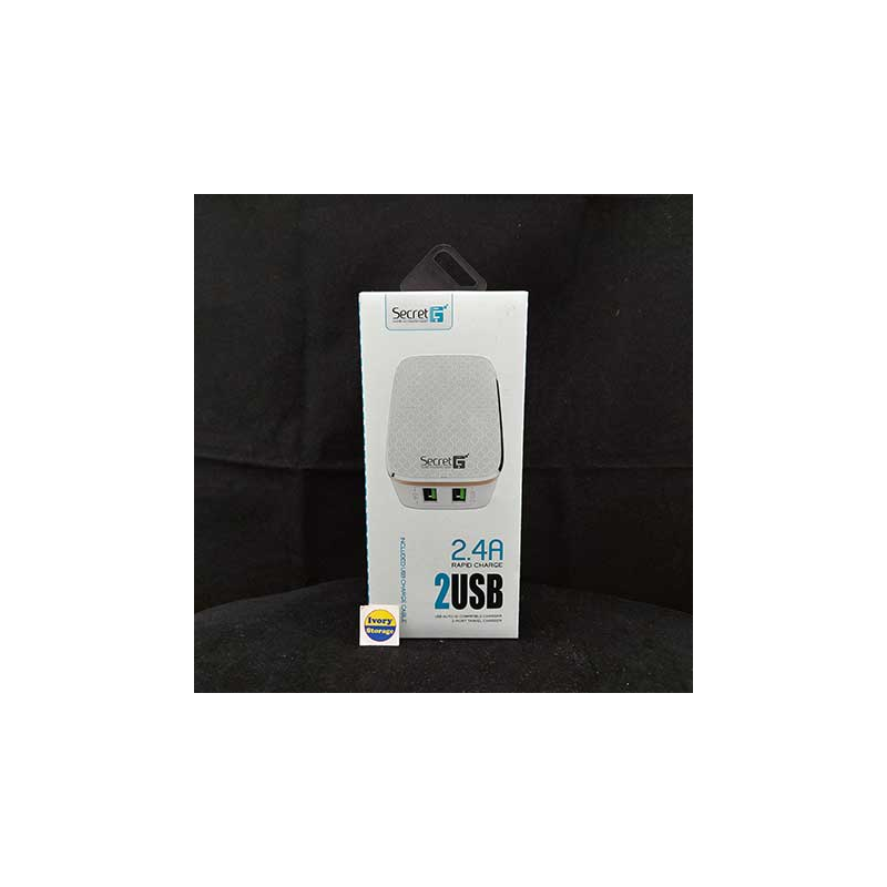 SECRETG 2-USB PORT POWER CHARGER 12W A2204 2.4A adalah Adaptor USB dengan teknologi Auto-ID Compatible Charger mengubah arus 100~240V AC(Listrik rumah/PLN) menjadi arus DC 5V dalam 2bh keluaran koneksi USB dengan daya total 12W dan kabel Micro USB Male sepanjang 1m Sehingga Anda dapat mengisi ulang 2 buah Smartphone/HP/Tablet/iPad/Gadget dengan besaran arus yang otomatis dipusatkan atau dibagi sesuai kebutuhan setiap alat hingga total arus 2.4A.