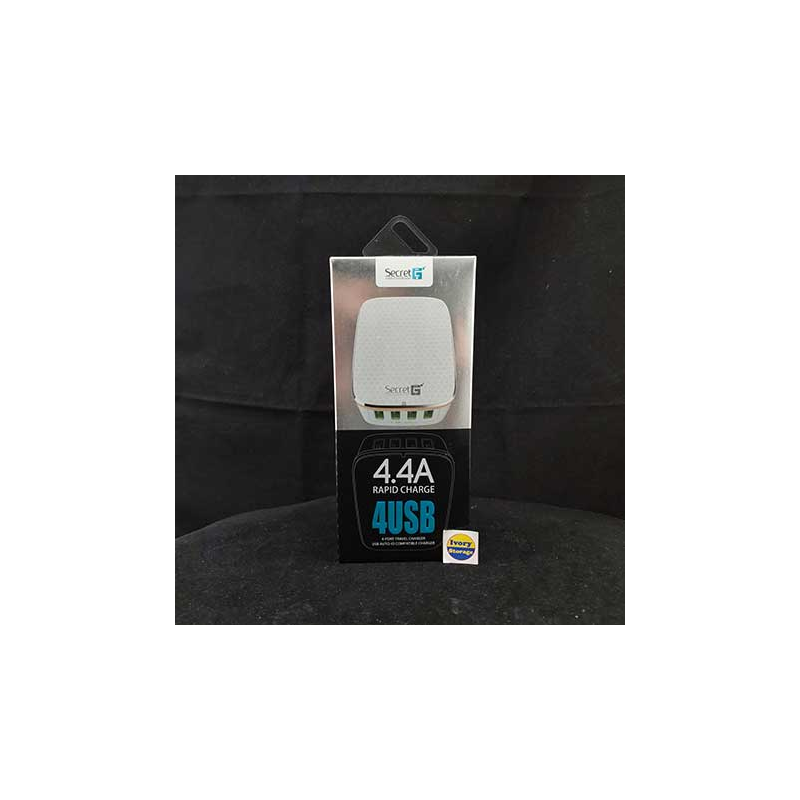 SECRETG 4-USB PORT POWER CHARGER 22W A4404 4.4A adalah Adaptor USB dengan teknologi Auto-ID Compatible Charger mengubah arus 100~240V AC(Listrik rumah/PLN) menjadi arus DC 5V dalam 4 buah keluaran koneksi USB dengan daya total 22W Sehingga Anda dapat mengisi ulang 4 buah Smartphone/HP/Tablet/iPad/Gadget dengan besaran arus yang otomatis dipusatkan atau dibagi sesuai kebutuhan setiap alat hingga total arus 4.4A.
