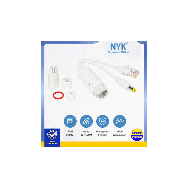 NYK KABEL POE SPLITTER WATERPROOF 1 SET CAT5 untuk luar ruangan menyediakan 2 buah konektor RJ45 10/100Mbps, 2 buah port RJ45 10/100Mbps 1 set konektor & soket power DC ukuran 5.5mm(diameter luar) dan 2.1mm(diameter dalam) dan mekanisme penyekatan debu & air sehingga Anda dapat mememperluas jaringan ketika tidak ada kabel/outlet listrik di lokasi alat(power adaptor disuntik via kabel LAN), memisahkan antara jalur kabel data & Tegangan dan pemakaian luar ruangan(outdoor) untuk Kamera IP/Access Point yang tahan cuaca(kedap air dan debu).
