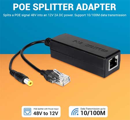 POE Splitter dengan 1 bh konektor RJ45 (Cat5), 1 bh port RJ45 (Cat5), konektor power DC ukuran 5.5mm(diameter luar) & 2.1mm(diameter dalam) dan penurun tegangan sehingga Anda dapat memisahkan antara jalur kabel data dan Tegangan(power adaptor disuntik via kabel LAN) dan mampu menurunkan tegangan dari 48V hingga 57V menjadi 12V 2A untuk Access Point/router/switch/kamera IP.