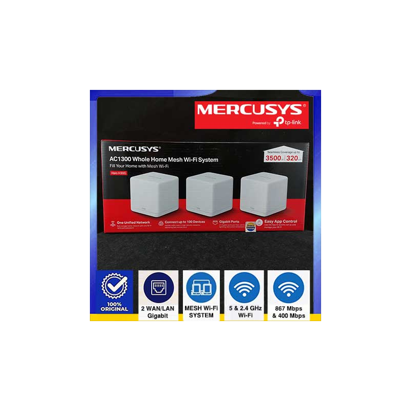 Mesh Wi-Fi System dengan kecepatan Wi-Fi 400Mbps(2.4GHz) & 867Mbps(5GHz), 2-port Gigabit LAN/WAN, internal antena dan MERCUSYS OneMesh™ sehingga Anda dapat membuat 1 jaringan Wi-Fi tunggal dengan 3 alat atau lebih untuk seluruh wilayah seluas 320m2(pemakaian 3 alat) untuk berbagi DSL/internet/file/video streaming/gaming/chat yg jernih/cepat/aman ke max.100 perangkat, stabil dan mudah dikelola.