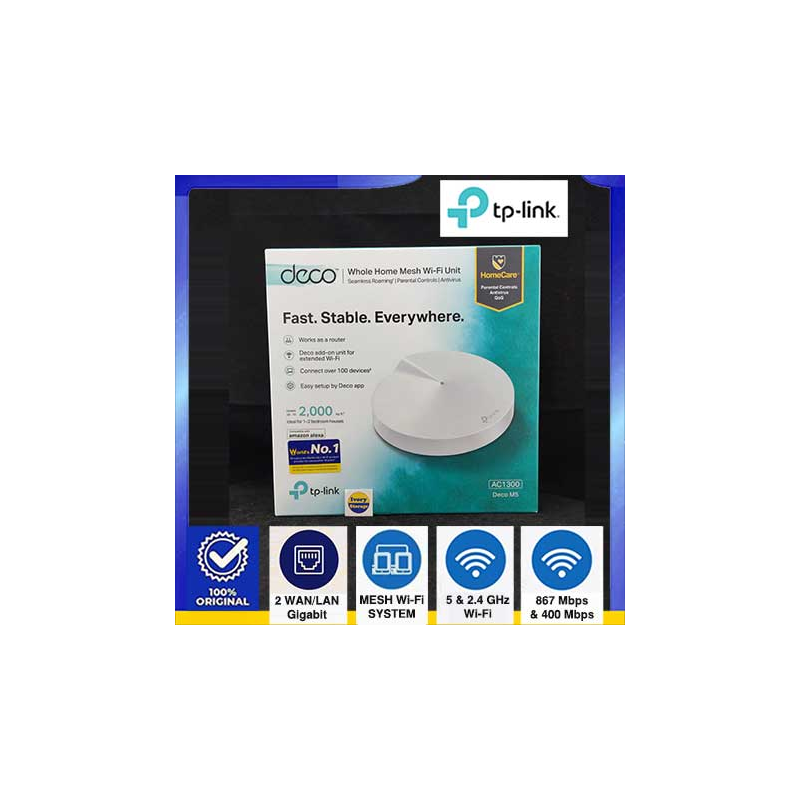AC1300 Whole Home Mesh Wireless System Dual Band Router DECO M5 isi 1 Pack dari TP-Link merupakan Solusi Anda yang menerapkan gabungan teknologi 5GHz dengan kecepatan 867 Mbps dan teknologi 2.4GHz dengan kecepatan 400Mbps Sehingga Anda mendapatkan kecepatan total bandwith 1.3 Gbps untuk sebuah rumah yang besar atau kantor seluas 186m2, dimana untuk membuka e-mail atau browsing website dapat menggunakan frekuensi 2.4GHz dan untuk pengerjaan yang sensitive seperti game online dan Video HD Streaming dapat diproses dengan frekuensi diatas 5GHz dengan kecepatan 867 Mbps pada saat bersamaan. Dengan 2 buah LAN/WAN Port 10/100/1000Mbps(Gigabit) dan 1 buah LAN/WAN Port 10/100/1000Mbps(Gigabit), koneksi yang bebas putus untuk 100 perangkat pengguna dan penguna mendapatkan jaringan yang kuat untuk media di rumah/kantor.