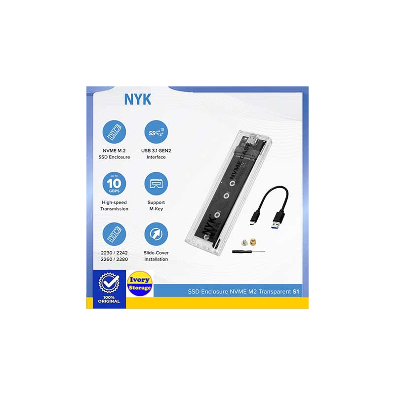 NYK SSD EXTERNAL CASE M2 NVME TYPE C S1 merupakan Enclosure SSD M.2 NVME dengan kabel external Type C 3.1 (USB-C) dan transfer rate 10Gbps Sehingga Anda dapat mengubah SSD M2 NVME internal menjadi layaknya Flashdisk/external hardisk dengan transfer data yang cepat dan dapat digunakan pada perangkat komputer/laptop/smartphone dengan koneksi kabel Type C.