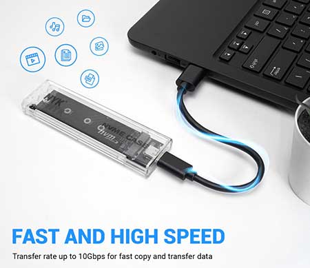 Enclosure SSD M.2 NVME dengan kabel external Type C 3.1 dan transfer rate 10Gbps Sehingga Anda dapat menjadikan SSD internal layaknya Flashdisk/external hardisk dengan transfer data yang cepat dan dapat digunakan pada perangkat komputer/laptop/smartphone dengan koneksi kabel Type C.
