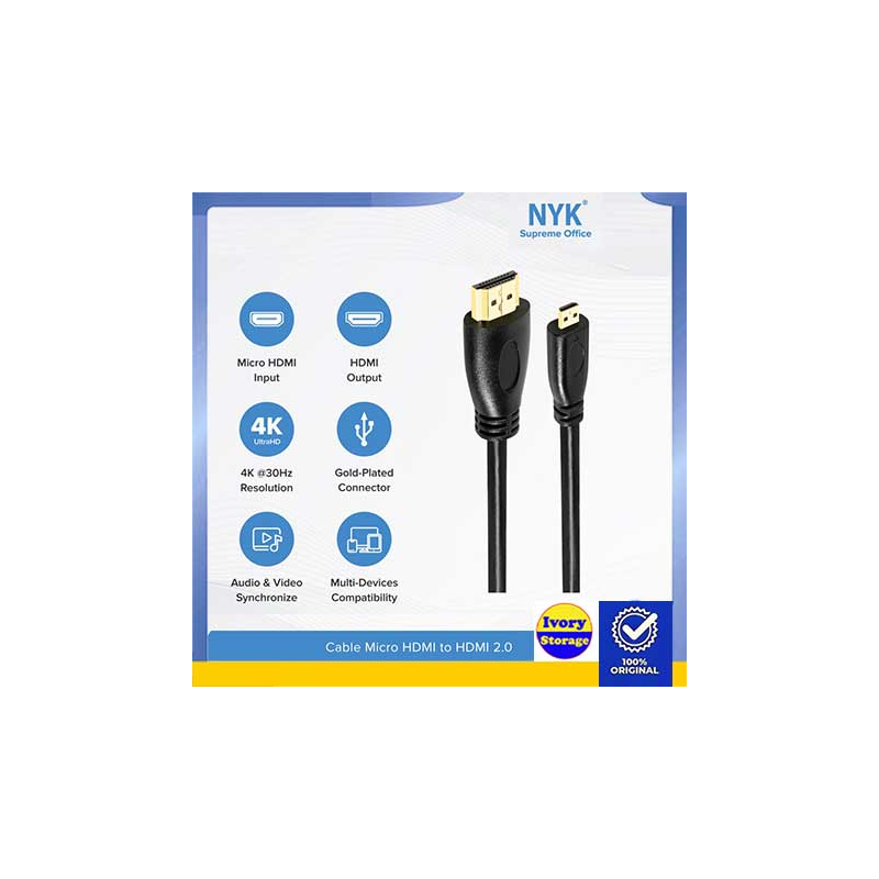 NYK KABEL MICRO HDMI MALE KE HDMI MALE 1.5M Memiliki 1 konektor input Micro HDMI Male, output 1 konektor HDMI Male dan panjang kabel 1.5m sehingga Anda dapat menghubungkan dari port Micro HDMI pada smartphone Anda ke port HDMI pada Proyektor/Monitor/TV untuk melihat foto/video/dokumen Anda.