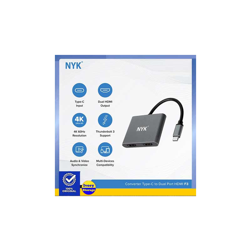 HDMI Splitter 2 Port NYK Type-C 4K memiliki input 1 port Type-C Female, output 2 Port HDMI Female, HDMI 4K 60Hz, support Thunderbolt 3, dan mekanisme pembagi jalur sehingga Anda dapat menayangkan dari 1 buah komputer/laptop ke 2 buah monitor komputer/proyektor/TV secara bersamaan dengan resolusi yang mendukung resolusi 4K.