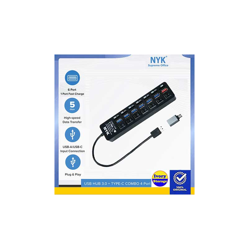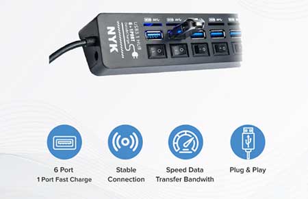 NYK 6+1 PORT USB HUB 3.0 U32-26 memiliki konfigurasi komponen internal yang dapat memperbanyak jumlah port atau koneksi USB komputer Anda dari 1 buah koneksi USB3.0 menjadi 6 buah koneksi USB3.0 dengan kecepatan transfer data 5Gbps dan 1 buah koneksi USB Fast Charging 20W, Auto - ID, indentitas pribadi pada masing-masing USB yang bebas gangguan kerja, saklar on-off disetiap koneksi hub, kerja tanpa eksternal power adaptor dan memiliki kabel pemanjang konektor USB sehingga Anda dapat menghubungkan secara bersamaan 7 buah peralatan eksternal(hampir 127 jenis peralatan semisal:printer/scanner/card reader/flashdisk/audio system/peralatan input lainnya) dan mencharging perangkat Anda(hingga 20 watt) ke 1 port USB komputer Anda dengan bebas kendala koneksi dan dapat memati-nyalakan koneksi di setiap jalur hub-nya).