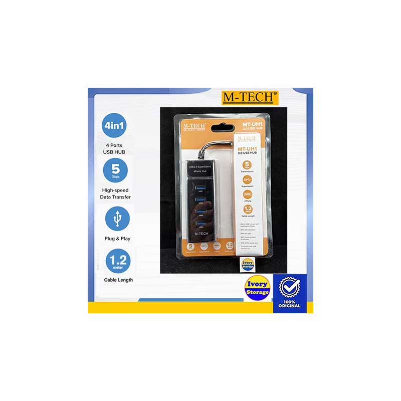 M-TECH 4 PORT USB HUB 3.0 MT-UH1 memiliki konfigurasi komponen internal yang dapat memperbanyak jumlah port atau koneksi USB komputer Anda dari 1 buah koneksi USB menjadi 4 buah koneksi USB dengan kecepatan transfer data 5Gbps, indentitas pribadi pada masing-masing USB yang bebas gangguan kerja, kerja tanpa eksternal power adaptor dan memiliki 1.2m kabel pemanjang konektor USB sehingga Anda dapat menghubungkan secara bersamaan 4 buah peralatan eksternal(hampir 127 jenis peralatan semisal:printer/scanner/card reader/flashdisk/audio system/peralatan input lainnya) ke 1 port USB komputer Anda dengan bebas kendala koneksi.
