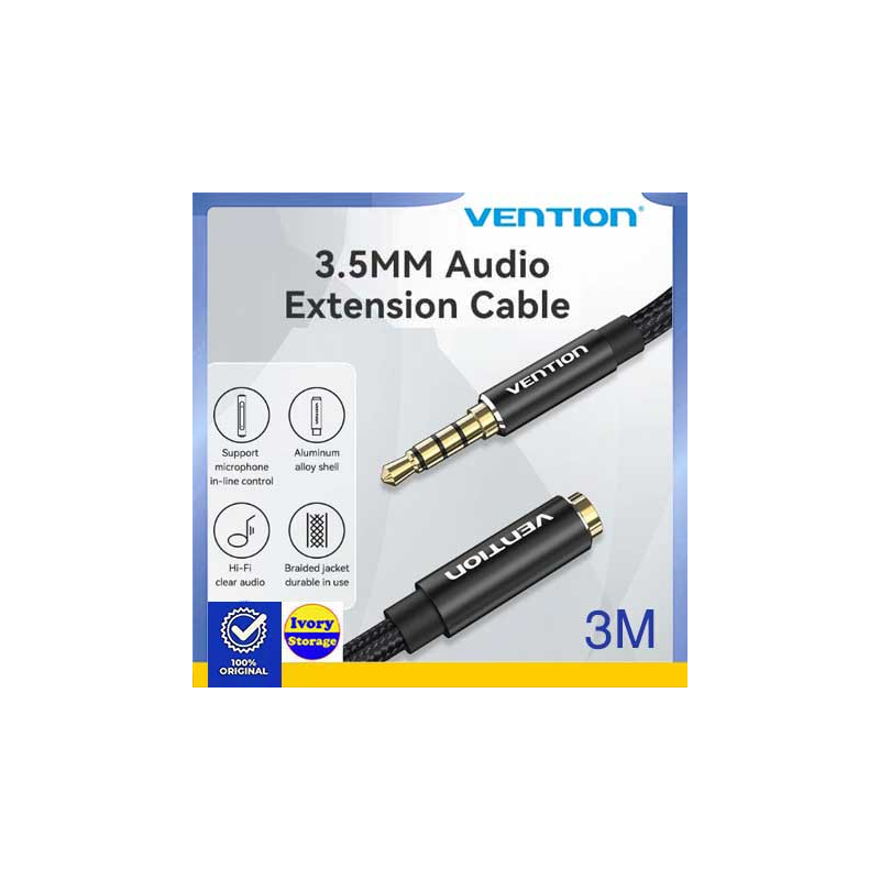 Kabel Ekstension Audio TRRS AUX 3.5mm 4 Pole VENTION 3m Stereo Braided BHCBI 3 meter merupakan produk dengan 1 1 bh male Aux 3.5mm 4 Pole Gold-plated plug, 1 bh female Aux 3.5mm 4 Pole Gold-plated plug/Anti-interference, high fidelity Sound Quality, kabel hubung sepanjang 3 meter, Conductor: Enameled Copper, Jacket : cotton Baided sehingga Anda dapat menghubungkan peralatan berbasis konektor 3.5mm(TRRS Conector) 4 Pole untuk menyalurkan Audio dan percakapan/Voice(dari microphone) disaat bersamaan dengan jernih, handal dan berkualitas tinggi.