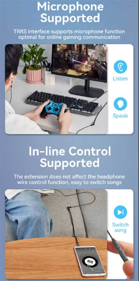 Produk dengan 1 bh male Aux 3.5mm 4 Pole Gold-plated plug, 1 bh female Aux 3.5mm 4 Pole Gold-plated plug, high fidelity Sound Quality, panjang 1.5 meter, Conductor: Enameled Copper, Jacket : cotton Braided sehingga Anda dapat menyambung kabel peralatan audio berbasis konektor 3.5mm(TRRS Conector) 4 Pole untuk menyalurkan Audio dan percakapan/Voice(microphone) dengan jernih dan berkualitas tinggi.