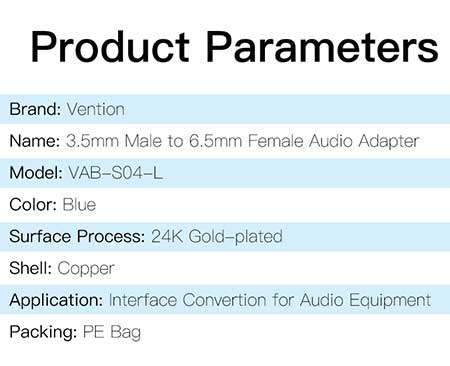 Converter Audio Aux 3.5mm to 6.5mm VENTION VAB-S04-L merupakan produk dengan 1 bh Aux 3.5mm male , 1 bh Aux 6.5mm female, 24K Gold-plated/Anti-interference, high fidelity Sound Quality dan shell: Copper sehingga Anda dapat menghubungkan peralatan sound system berbasis konektor 3.5mm(TRS Conector) dengan konektor Aux. 6.5mm dan berkualitas yang tinggi.
