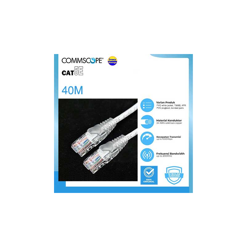Kabel transmisi data dengan 40 meter kabel UTP Cat.5E merek COMMSCOPE warna putih, 2 buah konektor RJ-45 merek COMMSCOPE/BELDEN, 2 buah Plug boot, dan standar pemasangan internasional tipe straight TIA/EIA-568-B sehingga Anda dapat menggunakannya untuk kebutuhan koneksi kabel di infrastruktur LAN & internet.