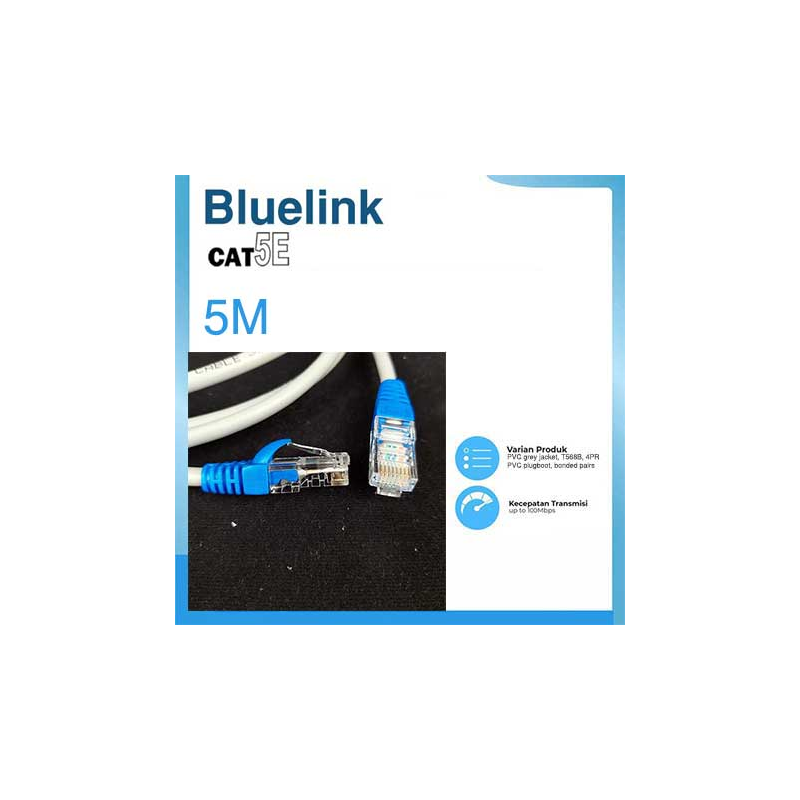 Kabel LAN CAT5E 5 meter menggunakan kabel standar UTP CAT5e(category 5e) warna abu-abu sepanjang 5m merek EYOTA dengan Modular konektor RJ45 dari produsen merek BELDEN/COMMSCOPE Original(asli) dan plug boot RJ45 warna hitam pada kedua ujung kabelnya sehingga menghasilkan kepastian kualitas sambungan komunikasi data yang baik pada jaringan infrastruktur LAN Anda, menghindari sambungan kabel terlepas saat lepas-pasang(lepas-colok) koneksi dari terminal alat/mesin dan menghemat uang Anda.