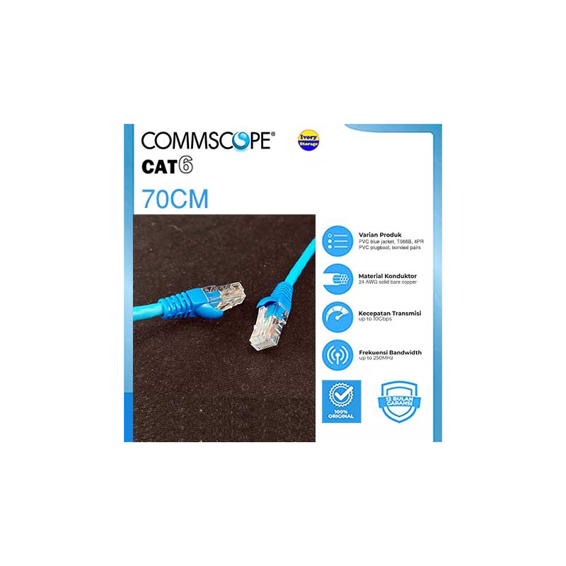Kabel transmisi data dengan 70 centimeter kabel UTP Cat.6 merek COMMSCOPE(dahulu bernama AMP), 2 bh konektor RJ-45 merek BELDEN, 2 bh plug boot, dan standar pemasangan internasional tipe straight TIA/EIA-568-B sehingga Anda dapat menggunakannya untuk kebutuhan koneksi kabel transmisi 10/100/1000Mbps(Gigabit) di infrastruktur LAN & internet.