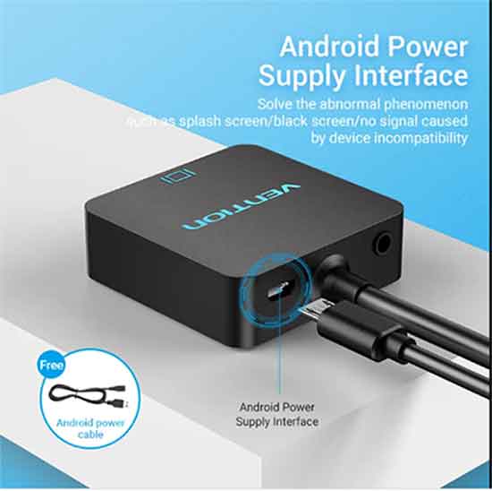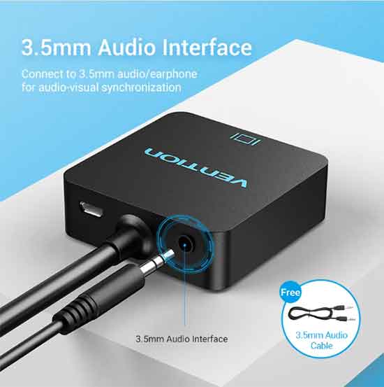 VENTION CONVERTER HDMI KE VGA WITH AUDIO Memiliki 1 konektor input HDMI Male, output 1 port VGA Female+3.5mm Aux Audio socket(to R+L), resolusi hingga 1080P@60Hz (1920×1080) dan colokan charger power supply dan mekanisme pengolah digital-analog sehingga Anda dapat menghubungkan dari port HDMI laptop/komputer PC ke port VGA pada Proyektor/Monitor/TV dan kabel audio speaker aux 3.5mm dengan jangkauan yang lebih jauh.