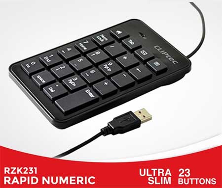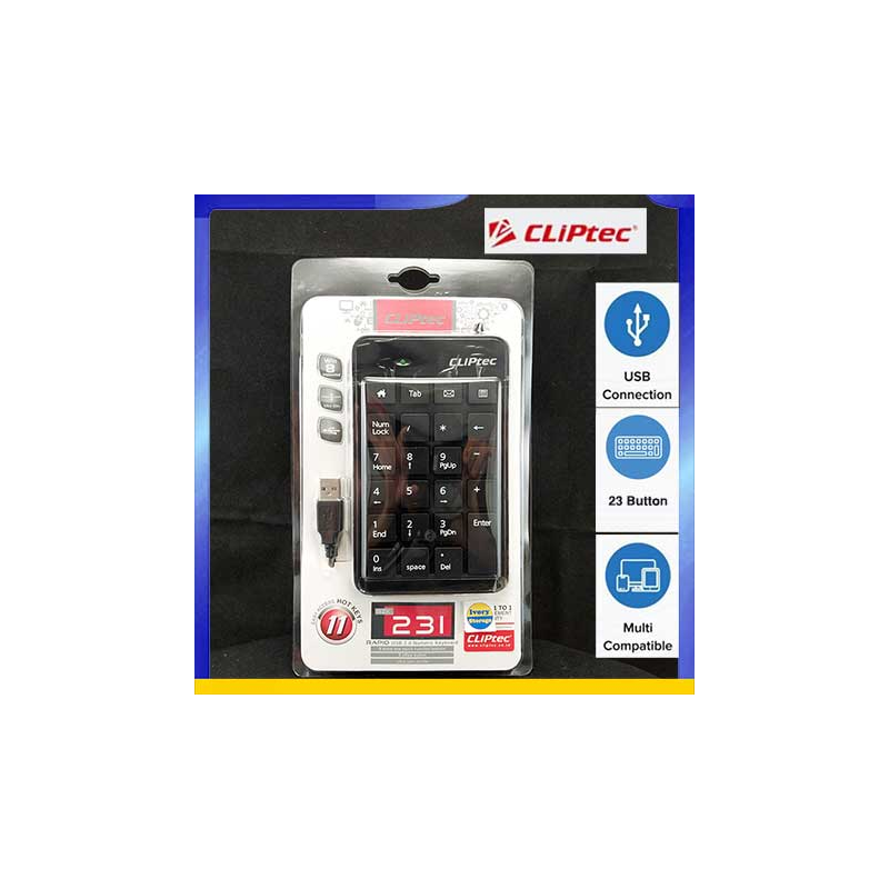 CLIPTEC RZK231 KEYBOARD NUMERIC KABEL merupakan NumberPad(Numeric Keypad/Digit Keyboard) USB dapat digunakan bersamaan dengan penggunaan keyboard standar dan NumberPad menggunakan 23 tombol angka+simbol kalkulator/perhitungan & Office hot keys sehingga memberikan Anda kemudahan bekerja dengan menggunakan banyak angka, kalkulasi perhitungan dan dapat juga menggantikan kerusakan fungsi tombol angka/simbol kalkulator pada keyboard standar Anda yang akan menghemat uang pembelian Keyboard baru. Produk ini didesain dengan kompak dan dapat digenggam tangan saat digunakan. NumberPad ini menggunakan koneksi USB yang dapat terhubung secara instan dalam waktu 3 detik tanpa restart(Plug & Play) sehingga Anda dapat langsung menggunakannya pada Desktop PC atau Notebook PC tanpa perlu restart(agar terdeteksi) yang akan menghemat waktu setup alat.