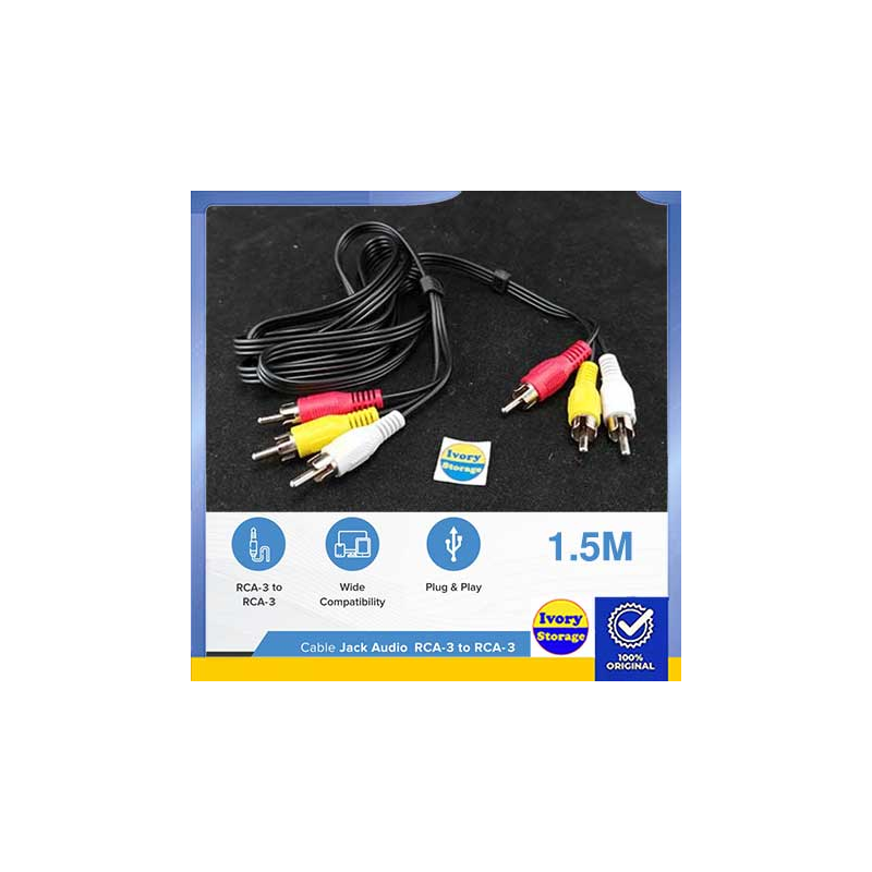 Kabel Audio Stereo dengan pasangan 3 Jack Male berwarna merah-putih-kuning pada kedua ujungnya dan kabel hubung sepanjang 1.5m sehingga Anda dapat menghubungkan antar peralatan berbasis RCA untuk mendapatkan suara stereo dan gambar sesuai standar player DVD/TV.