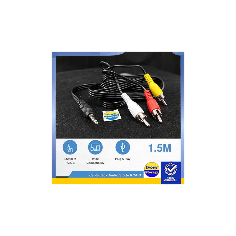 Kabel Audio Stereo dengan input Jack AUX 3.5mm dan output 3 buah Jack RCA Male berwarna merah-putih-kuning dan kabel hubung sepanjang 1.5m sehingga Anda dapat menghubungkan antar peralatan berbasis RCA untuk mendapatkan suara stereo dan gambar sesuai standar TV Box.