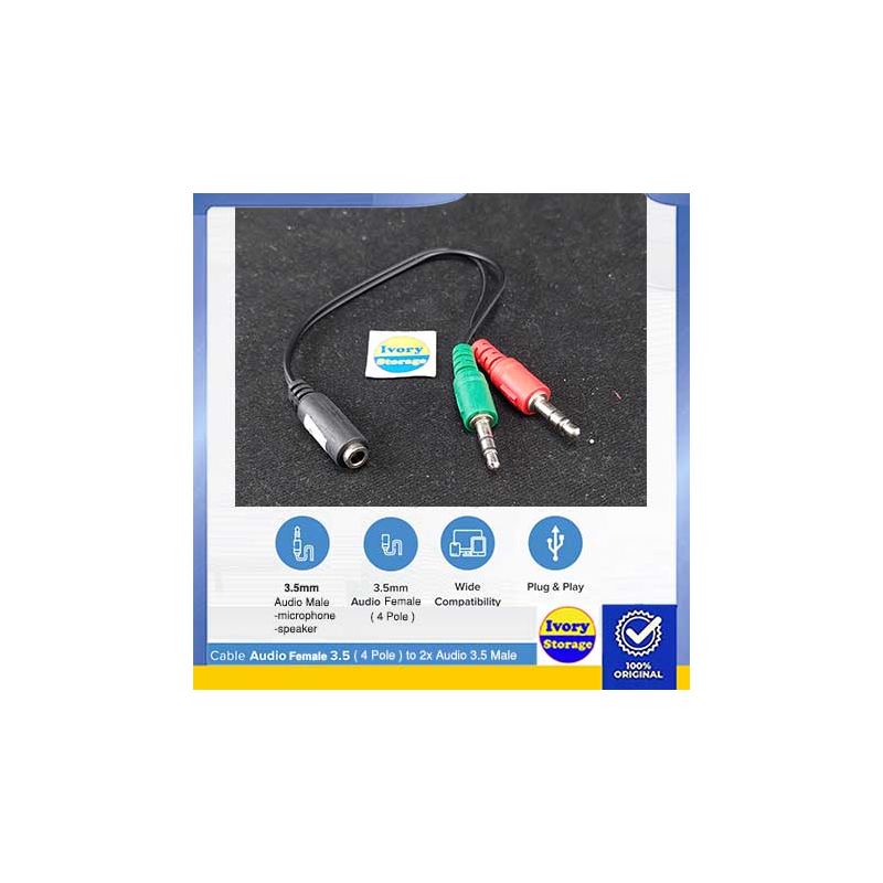 memiliki 1 bh kepala lubang(female) TRRS 3.5mm pada satu sisi dan 2 buah kabel dengan kepala konektor(male) Aux 3.5mm untuk Audio dan Microphone pada sisi lainnya, kabel penghubung antar Jack dan balutan produk yang kompak sehingga Anda dapat memisahkan antara Microphone(berbicara) dan Audio(speaker/headset) untuk mendengar.