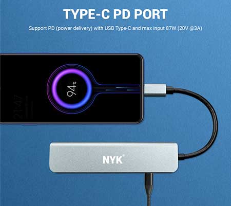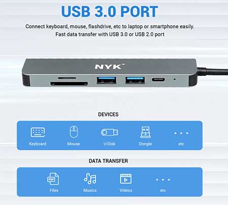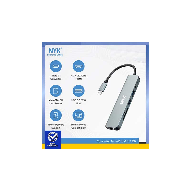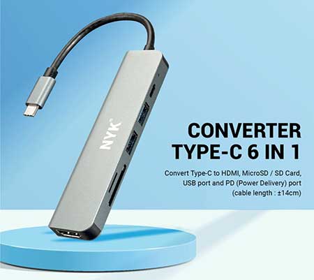 Type-C Docking Station NYK C6 dengan 3 Port USB Hub 3.0+HDMI adapter+Memory card reader yang memiliki konfigurasi komponen internal yang dapat memperbanyak jumlah port atau koneksi USB komputer Anda dari 1 buah koneksi Type-C menjadi 2 buah koneksi USB 3.0 dengan kecepatan transfer data 5Gbps, identitas pribadi pada masing-masing USB yang bebas gangguan kerja, 1 buah port HDMI support resolusi 3840*2160 / 30HzVer. 2.0, memiliki kabel pemanjang konektor sebesar 14cm, dan memiliki tambahan port Type-C untuk tambahan ekstra daya dari eksternal charger sehingga Anda dapat menghubungkan secara bersamaan 2 buah peralatan eksternal(hampir 127 jenis peralatan semisal:printer/scanner/card reader/flashdisk/audio system/peralatan input lainnya), menayangkan audio video ke proyektor/monitor/TV dengan koneksi jaringan kabel HDMI dengan kualitas hingga 4K Ultra HD dan membaca kartu memori(Micro SD dan SD Card) dari 1 port Type-C komputer/laptop Anda dengan bebas kendala koneksi yang dapat diletakan dimeja atau diatas casing CPU(tergantung layout) dan dapat ditingkatkan daya alat yang terhubung dengan penambahan daya dari charger Type-C atau sambil mengisi alat.