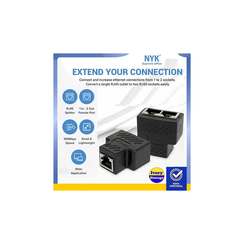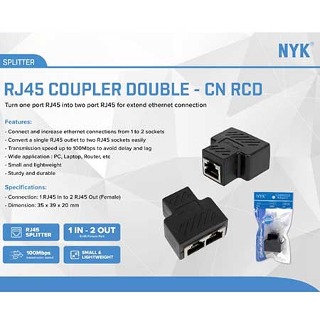 BAREL RJ45 CABLE COUPLER DOUBLE ETHERNET LAN ini memiliki cabang socket 1-2 RJ45 Female untuk konektor RJ45 CAT5/CAT6 yang berkualitas dan mekanisme converter didalamnya sehingga Anda dapat menggunakan 1 buah kabel LAN untuk menjembatani koneksi 2 jalur perangkat yang berbeda dengan menambahkan double coupler di setiap ujung kabel dan memiliki kecepatan upto 100Mbps.