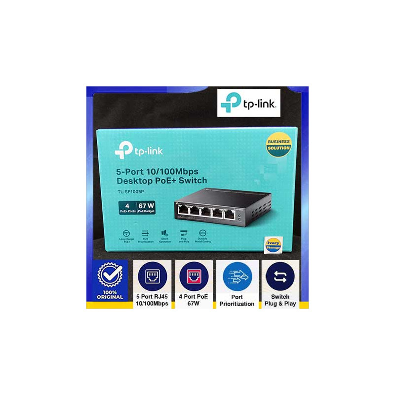 TL-SF1005P 5-port 10/100Mbps with POE Fast Ethernet Switch menyediakan 4 buah port RJ45 10/100Mbps dengan 4 buah port PoE+ dan 1 buah Port RJ45 10/100Mbps tanpa PoE yang Auto-Negotiation atau 4 dari 5 port memiliki kemampuan POE( Power over Ethernet), PoE budget total 67W dengan 30W max per port, jangkauan PoE hingga 250m, mendukung fungsi Auto MDI / MDIX, koneksi Plug-Play dan sehingga Anda dapat menggabungkan transfer data dengan kebutuhan daya dalam 1 kabel saja, menghilangkan kebutuhan untuk kabel crossover atau port Uplink, menggunakannya sebagai port umum/Uplink yang dapat dipasang ke server/hub/switch dengan kabel lurus atau kabel crossover dan bebas konfigurasi saat instalasi.