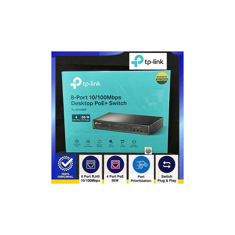 TL-SF1008P 8-port 10/100Mbps with POE Fast Ethernet Switch menyediakan 8 buah port RJ45 10/100Mbps yang Auto-Negotiation, 4 dari 8 port memiliki kemampuan POE( Power over Ethernet), mendukung fungsi Auto MDI / MDIX, koneksi Plug-Play dan sehingga Anda dapat menggabungkan transfer data dengan kebutuhan daya dalam 1 kabel saja, menghilangkan kebutuhan untuk kabel crossover atau port Uplink, menggunakannya sebagai port umum/Uplink yang dapat dipasang ke server/hub/switch dengan kabel lurus atau kabel crossover dan bebas konfigurasi saat instalasi.