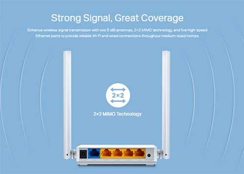 Produk ini memiliki transfer rate hingga 300Mbps atau 37.5MB/detik pada frekuensi 2.4-2.4835GHz yang kompatibel dengan produk standar IEEE 802.11b/g dan menggunakan Antena dengan MIMO Technology yang bekerja secara simultan untuk menguatkan sinyal agar terhindar dari intervensi/penurunan sinyal saat transmisi atau hambatan fisik lingkungan sehingga Anda dapat membuat koneksi jaringan dengan jangkauan lebih jauh dan kecepatan transfer lebih cepat dari produk standar Wireless G Product.