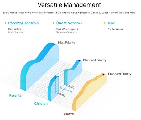 Produk ini menggunakan WPA dan firewall yang melakukan penyaringan alamat IP/MAC address/Nama Domain, IP QoS, Tombol QSS untuk aktifasi WPA Encryptions secara instan,"IP based bandwidth control", "parental control" dan "guest network" sehingga Anda dapat dengan mudah mengelola pengguna jaringan/akses internet, menentukan alokasi konsumsi bandwidth dan prioritas yang besarnya berbeda-beda ditiap pengguna komputer(besarnya bisa sama atau ada yang besar dan ada yang kecil tergantung prioritas) untuk membebaskan pengguna internet dari lambatnya koneksi internet akibat kegiatan pengguna lain yang banyak menyedot bandwith, melakukan pembatasan koneksi dan memberikan perlindungan yang instan untuk mencegah masuknya penyusup agar tidak terhubung dengan jaringan Anda.