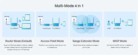 TL-WR844N memiliki Multi-Mode 4 in 1 untuk memgfungsikan perangkat menjadi Router, Access Point, Range Extender, dan WISP sehingga Anda dapat menjembatani atau memperluas jangkauan jaringan wireless sesuai kebutuhan Anda.