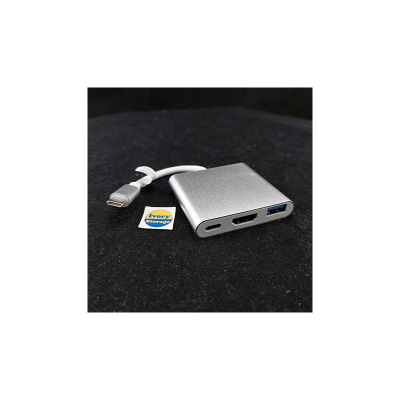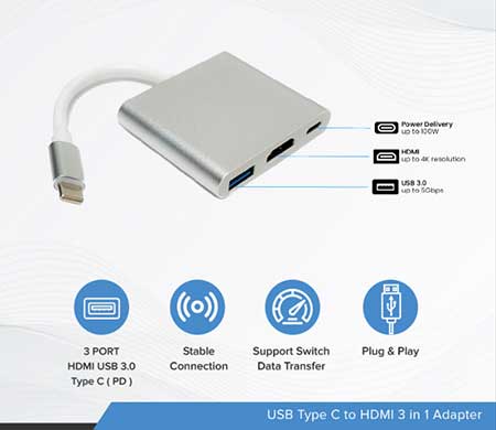 Adapter ini berfungsi untuk mengubah port USB Type C menjadi 3 buah port berbeda yaitu USB 3.0. HDMI dan USB. Dengan ini Anda dapat menghubungkan berbagai perangkat USB dan juga monitor melalui kabel HDMI