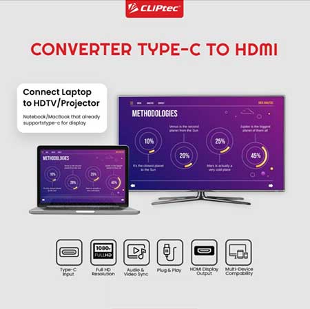 CLIPTEC CONVERTER USB 3.1 Type C KE HDMI (USB-C to HDMI) Memiliki 1 konektor input USB 3.1 Type C (USB-C) male dan output 1 konektor HDMI Female sehingga Anda dapat menghubungkan dari port USB-C Smartphone/ tablet/ laptop/ komputer Anda ke port HDMI pada Proyektor/ Monitor/ TV Anda.
