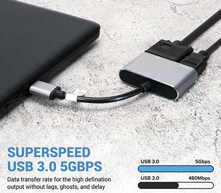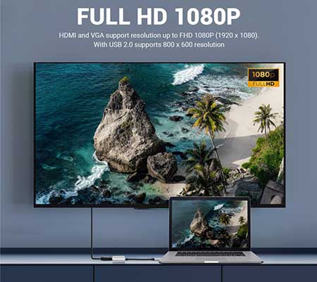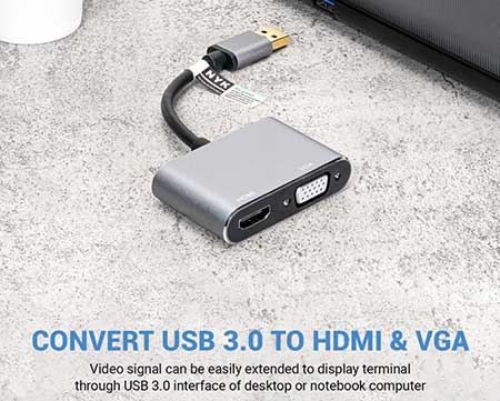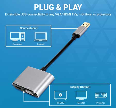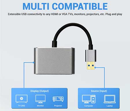 Memiliki 1 konektor input USB 3.0 Male dan output: 1 HDMI Female+1 VGA Female sehingga Anda dapat menghubungkan USB3.0 laptop /komputer Anda ke berbagai perangkat display seperti TV, Monitor, dan proyektor melalui pilihan kabel HDMI atau kabel VGA.
