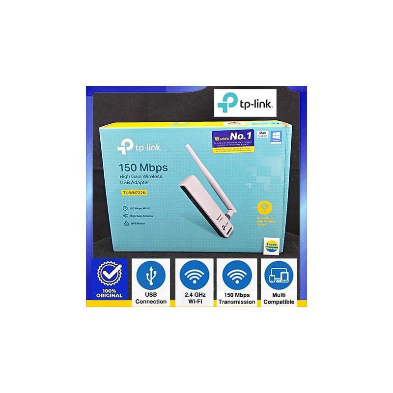 150Mb Wireless High Gain USB Adapter TL-WN722N TP-LINKdengan AlignTM 1-stream technology yang mengacu pada standar teknologi 802.11n bekerja pada frekuensi 2.4-2.4835 GHz untuk menghubungkan tanpa kabel antar peralatan jaringan LAN dan internet yang memiliki kemampuan Wireless Signal Rates 150Mbps, WPA2 encryption, Antena 4dBi omni-directional(detachable), QSS untuk setup keamanan yang instan, Support 64/128-bit WEP/128 bit WPA standard(TKIP/AES)/MIC/IV Expansion/IEEE 802.1x dan shared Key Authentication sehingga Anda dapat bekerja dengan jaringan tanpa kabel untuk mengakses jaringan internet yang bebas meletakan lokasi komputer/peralatan networking lainnya, kecepatan transfer data yang baik untuk kebutuhan Internet/ downloading/ gaming/video streaming/dll., ringan ditangan, bebas gangguan koneksi pada lingkungan yg buruk/jangakauan yang jauh(bahkan terpisahkan oleh 2 lantai), keamanan lalu lintas komunikasi data, penggunaan energi yang rendah, tanpa baterai, hemat waktu penyiapan/penyimpanan, bebas pemakaian kabel jaringan dan hemat uang.