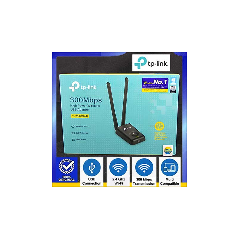 300M High Power Wireless LAN USB Adapter TL-WN8200ND TP-LINK yang bekerja pada frekuensi 2.4-2.4835 GHz untuk menghubungkan tanpa kabel antar peralatan jaringan(transmitter & receiver) dan WLAN ke LAN. Produk ini memiliki kemampuan Wireless Signal Rates With Automatic Fallback hingga 300Mbps dengan transmisi output power, sensitifitas penerimaan sinyal yang andal, 2 buah 5dBi external detachable antenna, perlindungan komunikasi jaringan tanpa kabel dengan 1 buah tombol untuk security setup dan temperatur kerja 0 s/d 40 derajat celcius sehingga Anda dapat bekerja dengan jaringan LAN & jaringan internet tanpa kabel dengan kekuatan transmisi data yang dapat menjangkau 10x lebih jauh dari tipe standar, kecepatan transfer data yang tinggi untuk efisiensi waktu kerja Anda, bebas gangguan koneksi sinyal karena dapat menembus banyak dinding dan lantai, bebas meletakan lokasi komputer/peralatan networking lainnya, ringan ditangan, keamanan lalu lintas komunikasi data dari gangguan luar/orang asing, melakukan setup keamanan jaringan yang instant(bahkan tanpa perlu mengingat password), penggunaan energi yang rendah, tanpa baterai, hemat waktu penyiapan/penyimpanan alat, bebas pemakaian kabel jaringan dan hemat uang.